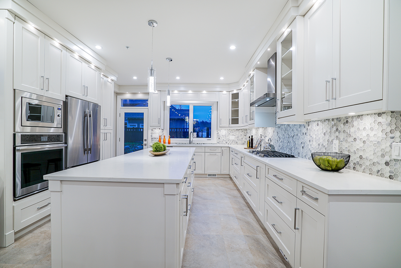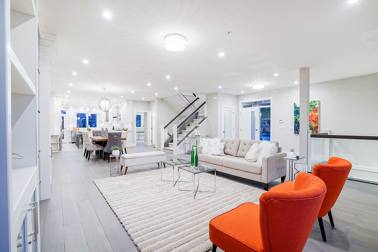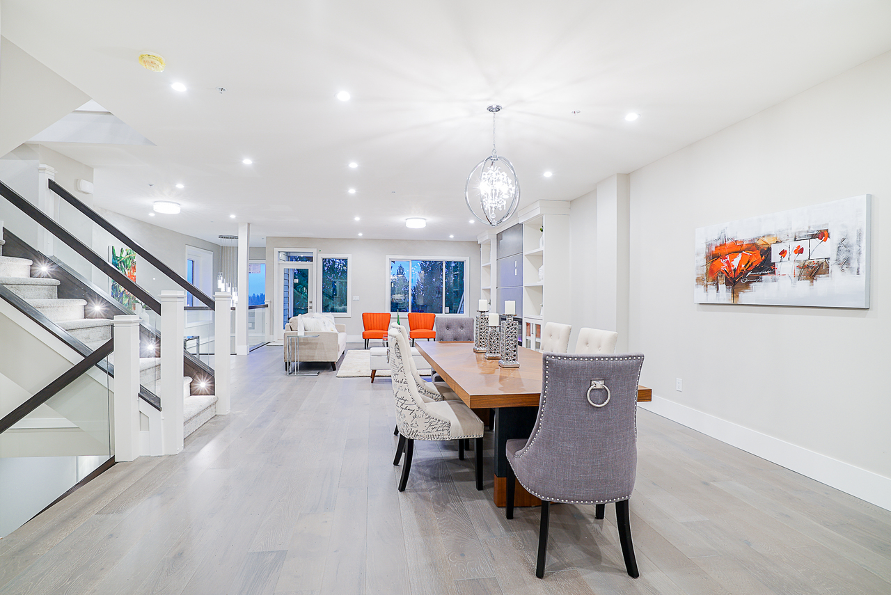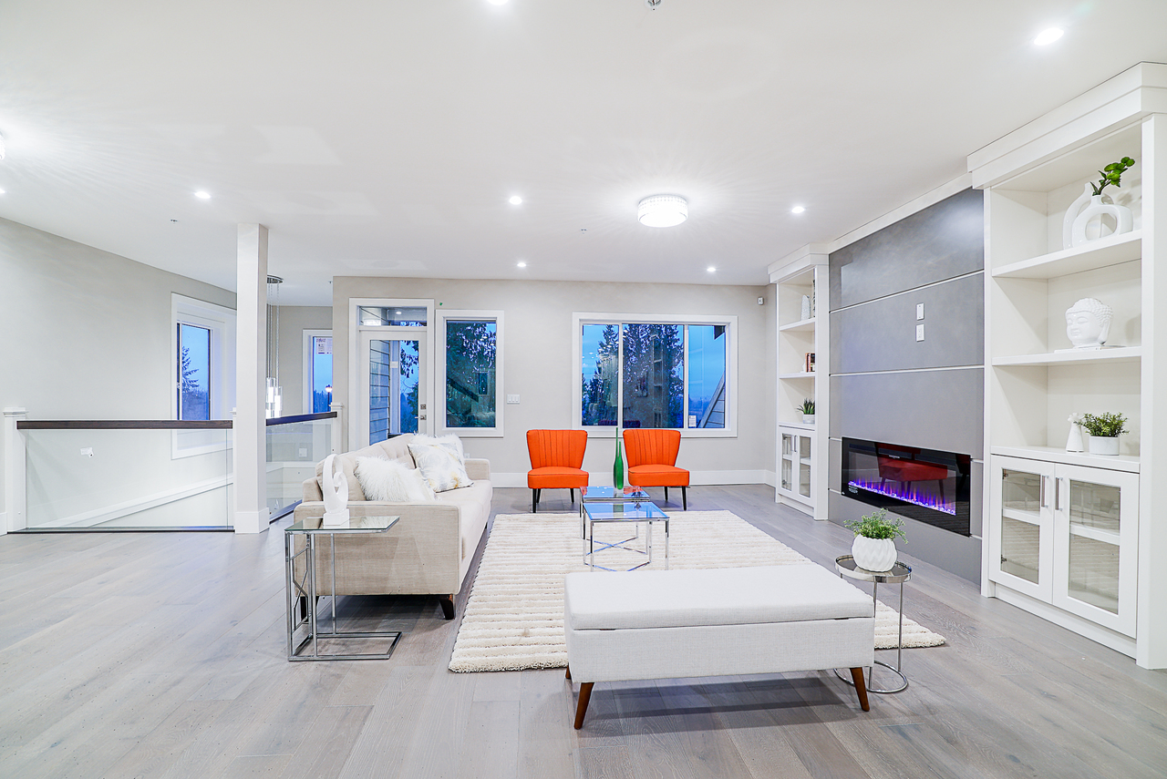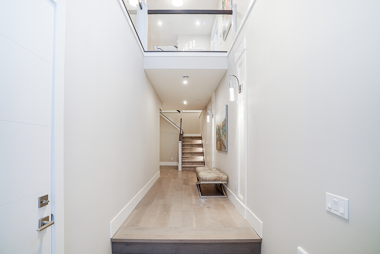 CORNER HOME WITH A VIEW : A collection of 4 brand new, freehold strata, row homes boasting sophisticated and modern interiors with panoramic views of the mountains from both your living room and master bdrm. Spread over 3,600 sqft are 5 full bdrms + lrg theatre rm. An enviable interior appointed with 9 ft ceilings, engineered h/w flrs, A/C, wood glass railings,Jenn Air Appliances, custom millwork and multiple patios - these 4 homes FEEL and LIVE like a detached property. Gorgeous hardi plank exterior w/ elegant stone encased front door entry.