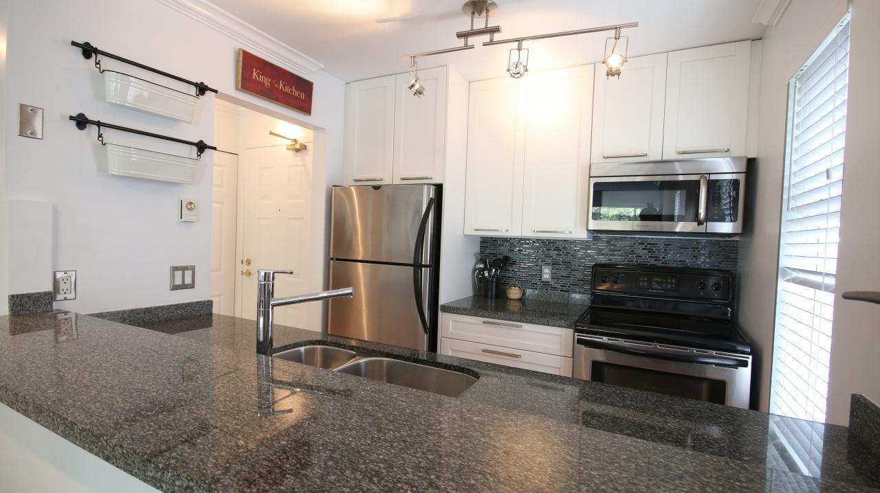 ULTIMATE LOCATION & TOTALLY RENO'D. Upper corner unit. Well planned & tastefully reno'd 1 bed/bath unit. Kitchen updated w/laminate flrs, soft closing cabinets, granite counters, backsplash, sink, faucet & light fixtures. NEW baseboards, crwn mouldings, carpets, blinds. Bath NEW toilet, tub, tiles, flrs, sink, vanity. Wood closet organizers. Newly tiled F/P. Entire home recently painted-just move in! Quiet NW facing enclosed patio. Insuite w/d. 1 u/g parking w/locker. Short drive to Airport. 2 mins & you're on HWY99. 5 mins & you're in Richmond. 20 min walk to Marine/Cambie skytrain. 19+ older bldg. Cats allowed. No rentals-fully owner occupied bldg. Very well run strata. All meas approx. Buyer to verify if impt. Call today!